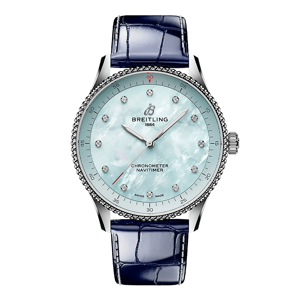 Breitling's icoon voor onderweg. De Navitimer is een van de meest herkenbare horloges ooit gemaakt. Het staat op de lijsten van verzamelaars van de beste horloges aller tijden. Wat in 1952 begon als een instrument voor piloten, heeft nu iets diepgaands betekend voor iedereen die dit uurwerk heeft meegenomen op zijn of haar persoonlijke reis. Ons icoon is er nu in de maten 36 en 32 mm voor vrouwen en mannen die houden van het uiterlijk en het gevoel van een horloge met een kleinere diameter. Terwijl de 36 mm Navitimer is voorzien van de kralenring en de iconische ronde schuifregelaar die de Navitimer zijn onmiskenbare uiterlijk geven, ziet de oogverblindende 32 mm variant af van de schuifregelaar ten gunste van een vereenvoudigd ontwerp van de wijzerplaat dat past bij de slanke diameter. Maar deze showstoppers hebben zoveel meer te bieden dan alleen hun nieuwe afmetingen. De combinatie van pastelkleuren, parelmoer en traceerbare edele materialen met subtiele verfijningen geven de horloges een juweelachtige uitstraling - een veelzijdige elegantie voor het legendarische navigatiehorloge dat klaar is voor waar de reis je ook brengt.