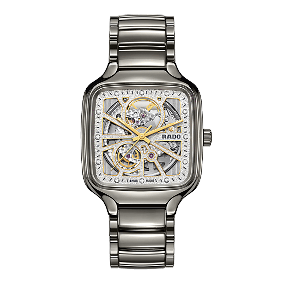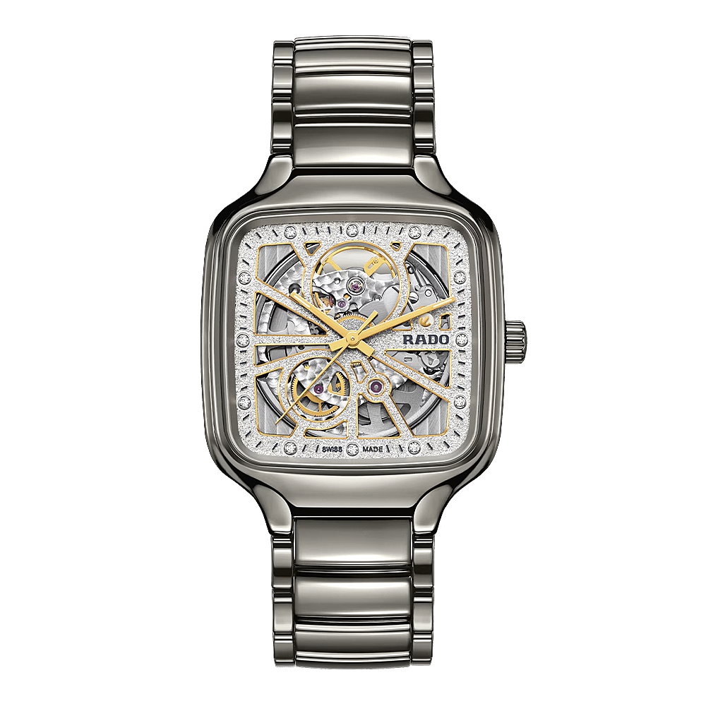 Deze Rado True Square Open Heart schittert met diamanten van topklasse, een sprankelende nieuwe wijzerplaat en een monoblok vierkante kast van gepolijst plasma high-tech keramiek. Een saffierglas geeft extra glans aan de wijzerplaat met 12 diamanten indexen en een rhodiumkleurige afwerking die lijkt op diamantpoeder. Een laag reliëf grijze minutenring omcirkelt de geelgoudkleurige uur- en minutenwijzers met Super-LumiNova®-accenten en een geelgoudkleurige secondewijzer. Uitgesneden vensters trekken de aandacht naar het hart van het horloge, waar het automatische Rado-kaliber R734-uurwerk betrouwbare nauwkeurigheid levert met een antimagnetische NivachronTM-spiraalveer en een opmerkelijke gangreserve van 80 uur. De wijzerplaat is ontwikkeld met behulp van een uniek elektroformingsproces dat een diamantpoederachtige afwerking oplevert en ervoor zorgt dat het Rado-logo, de markeringen en de minutenringen in reliëf uit de basis van de wijzerplaat naar voren komen, het eindresultaat van galvanische groei. Gepolijst plasma hightech keramiek, een schitterende wijzerplaat en 12 jubilé-diamanten zorgen samen voor onweerstaanbare luxe en elegantie.