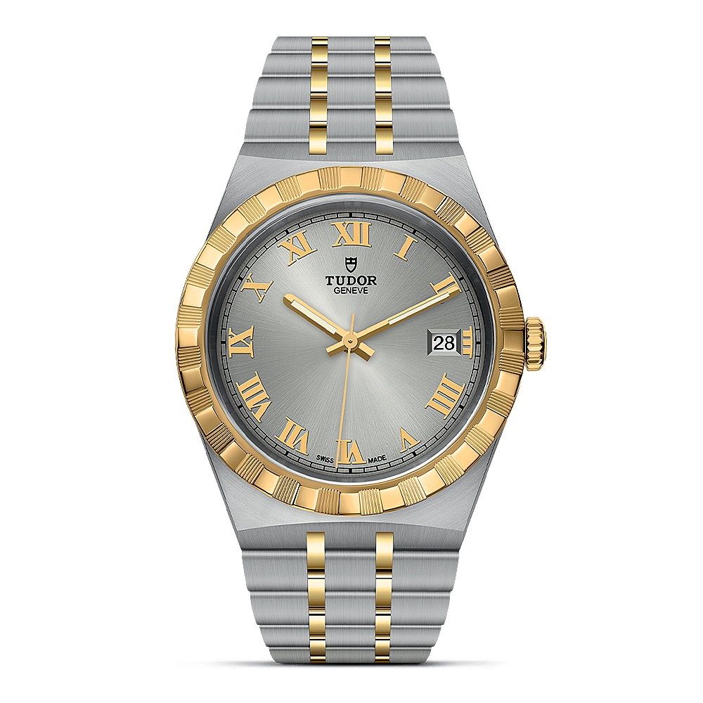 Met zijn geïntegreerde metalen armband, gekartelde of met diamanten bezette lunette en automatisch uurwerk is de TUDOR Royal-serie het toonbeeld van veelzijdige en betaalbare sportieve chic. Voor een laatste vleugje elegantie heeft TUDOR Romeinse cijfers als uurmarkeringen toegevoegd aan de TUDOR Royal-horloges. Alle wijzerplaten zijn voorzien van deze Romeinse cijfers of een combinatie van Romeinse cijfers en acht met diamanten bezette uurmarkeringen.